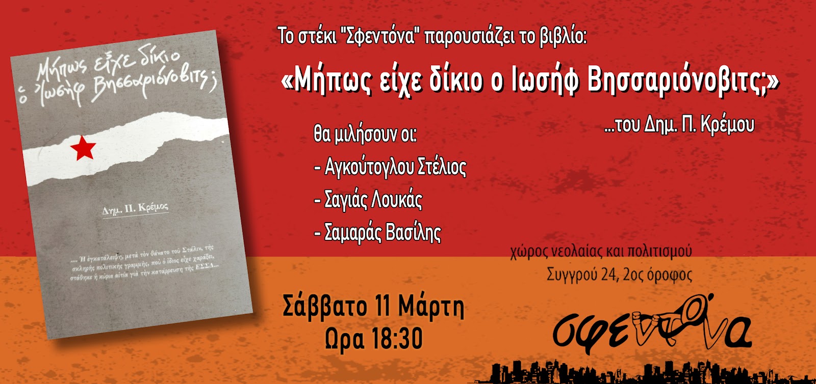 Το στέκι "Σφεντόνα" το Σάββατο 11 Μάρτη παρουσιάζει το βιβλίο "Μήπως είχε δίκιο ο ιωσήφ Βισσαριόνοβιτς;" του Δημήτρη Π. Κρέμου